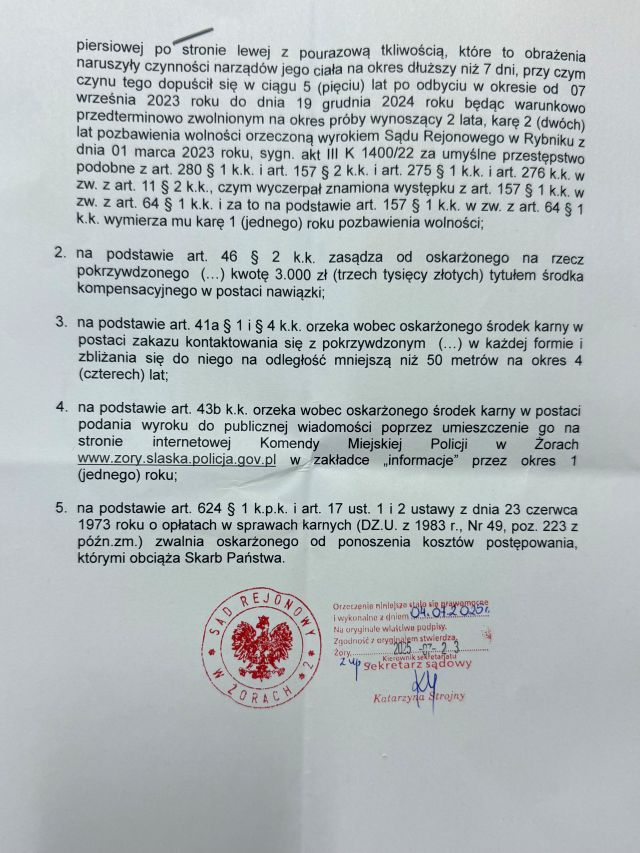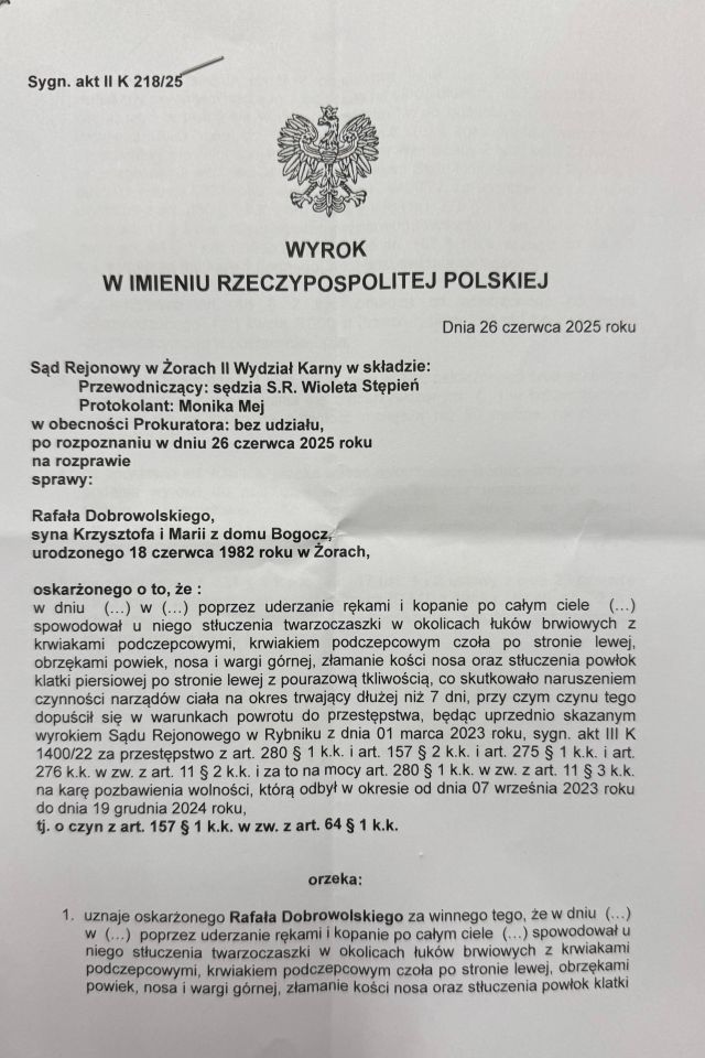 Decyzją Sądu Rejonowego w Żorach publikujemy wyrok skazujący Pana Rafała Dobrowolskiego (Dobrowolski), oskarżonego o spowodowanie średniego uszczerbku na zdrowiu, działając w warunkach powrotu do przestępstwa. Został uznany za winnego zarzucanych mu czynów i wymierzono mu łączną karę 1 roku pozbawienia wolności. Wobec oskarżonego orzeczono także nawiązkę na rzecz poszkodowanego oraz zakaz zbliżania się i kontaktowania z poszkodowanym.