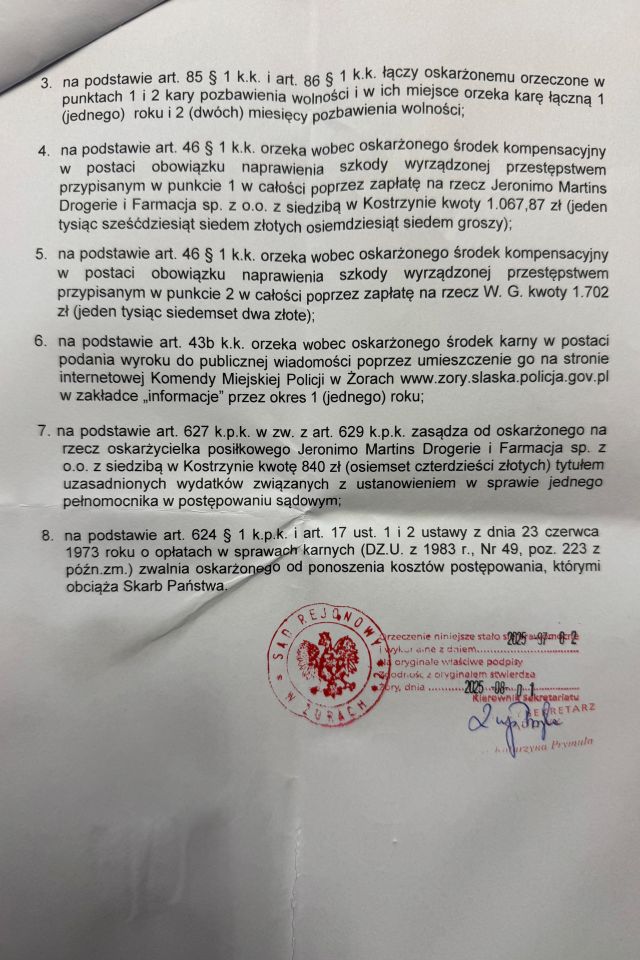 Decyzją Sądu Rejonowego w Żorach publikujemy wyrok skazujący Pana Michała Łysienia (Łysień), oskarżonego o kradzież i zniszczenie mienia, działając w warunkach powrotu do przestępstwa. Został uznany za winnego zarzucanego mu czynu i skazano na łączną karę 1 roku i 2 miesięcy pozbawienia wolności, orzeczono także środek kompensacyjny w postaci obowiązku naprawienia szkody.