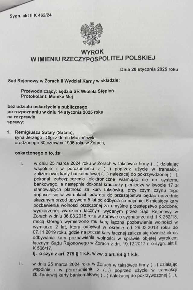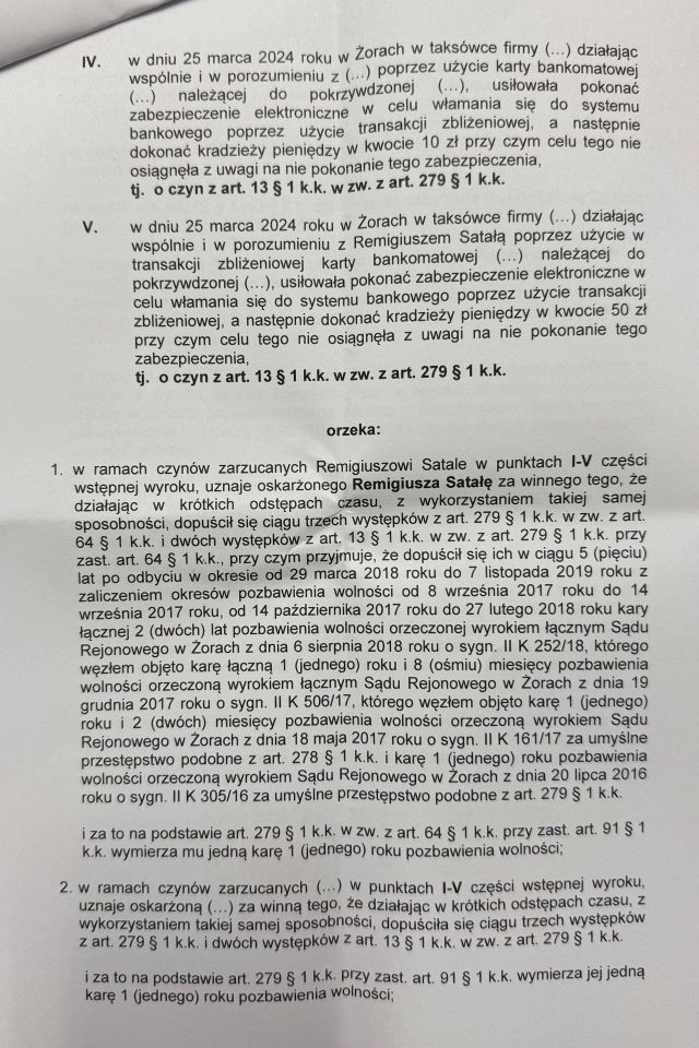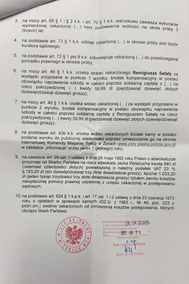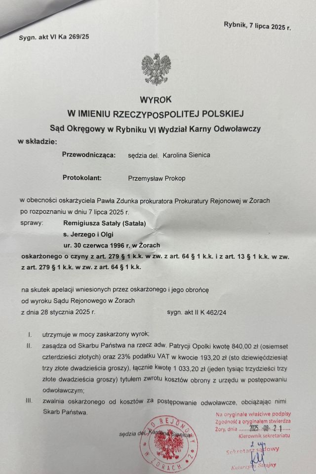 Decyzją Sądu Rejonowego w Żorach publikujemy wyrok skazujący Pana Remigiusza Satałę (Satała), oskarżonego o kradzieże z włamaniem. Został uznany za winnego zarzucanych mu czynów i skazano na karę 1 roku pozbawienia wolności z warunkowym zawieszeniem wykonania kary na okres próby 3 lat, poddano oskarżonego pod dozór kuratora sądowego, zobowiązano do przestrzegania porządku prawnego w okresie próby, a także orzeczono także obowiązek naprawienia szkody na rzecz pokrzywdzonego.