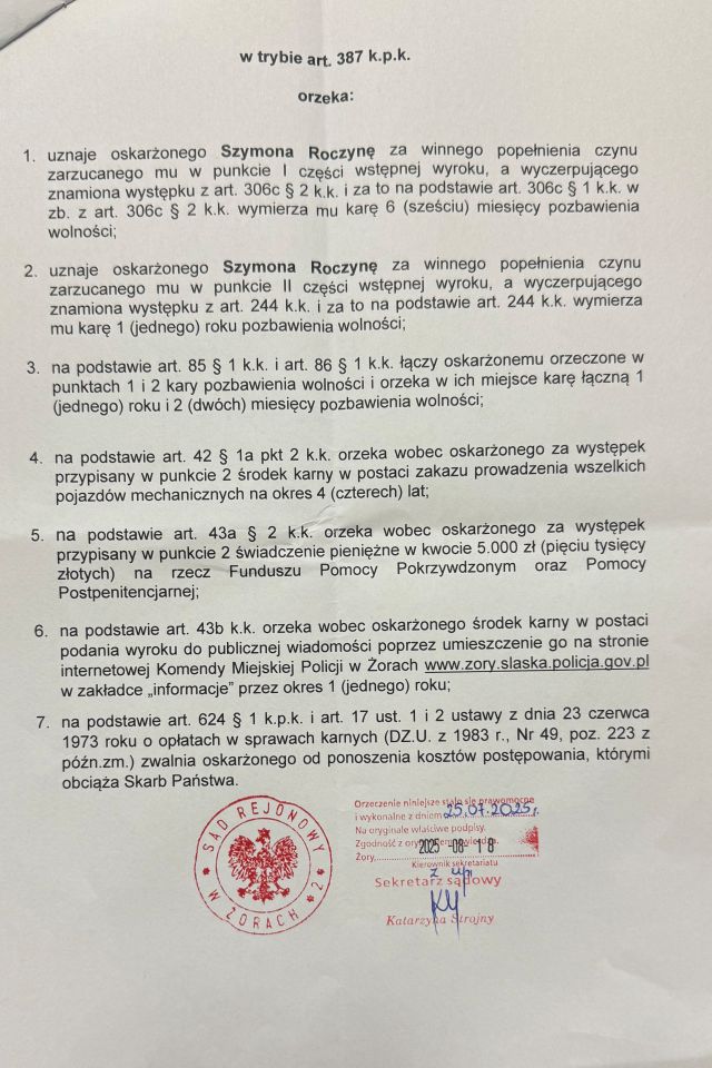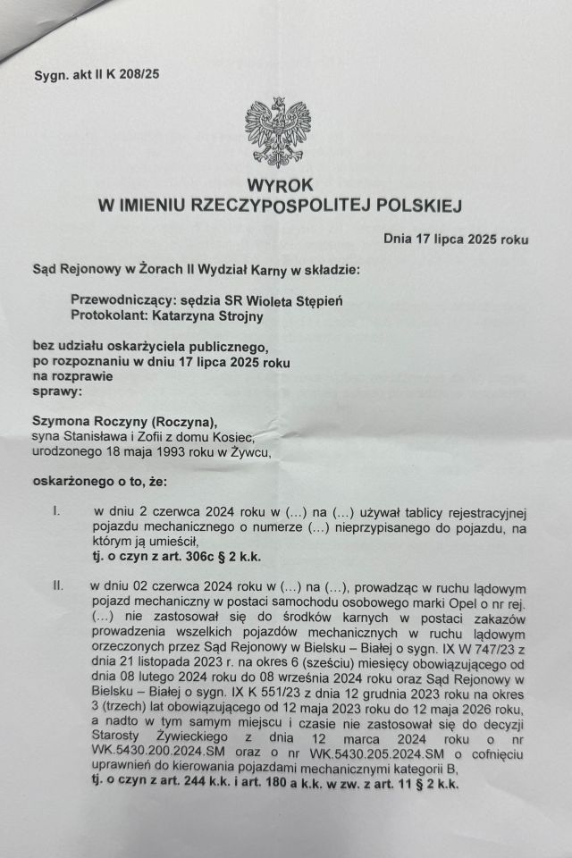 Decyzją Sądu Rejonowego w Żorach publikujemy wyrok skazujący Pana Szymona Roczyny, oskarżonego o używanie tablicy rejestracyjnej pojazdu mechanicznego nieprzypisanego do pojazdu, a także prowadził samochód wbrew orzeczonemu przez sąd zakazowi prowadzenia wszelkich pojazdów mechanicznych. Został uznany za winnego zarzucanego mu czynu i skazano na łączną karę 1 roku i 2 miesięcy pozbawienia wolności. Ponadto orzeczono środek karny w postaci zakazu prowadzenia wszelkich pojazdów na okres 4 lat oraz świadczenie pieniężne na rzecz Funduszu Pomocy Pokrzywdzonym oraz Pomocy Postpenitencjarnej.