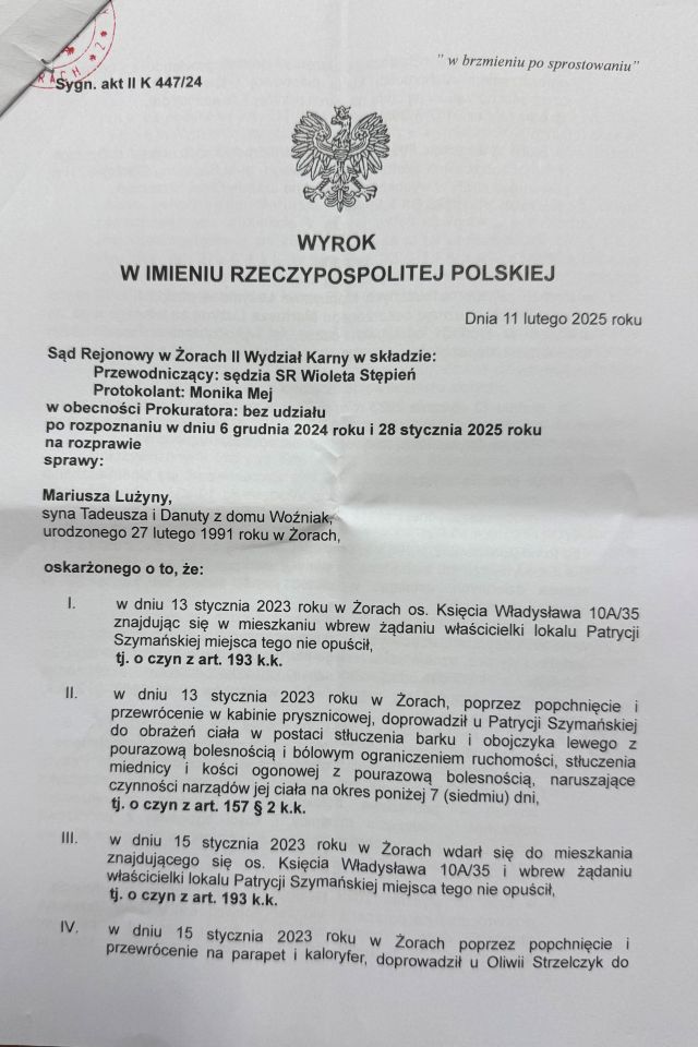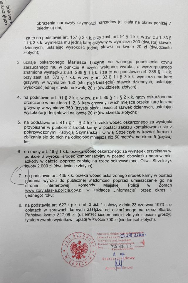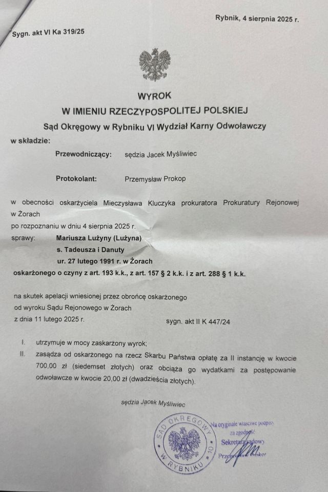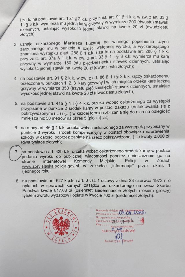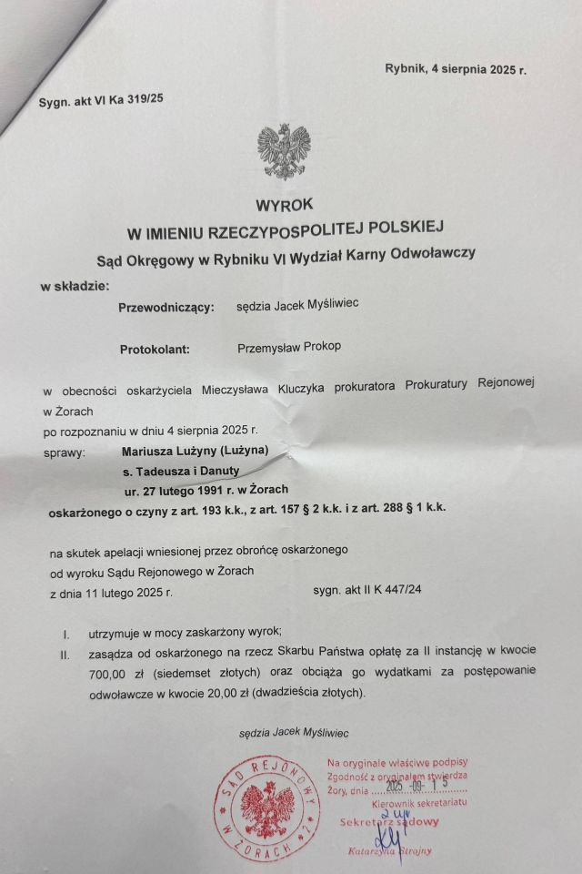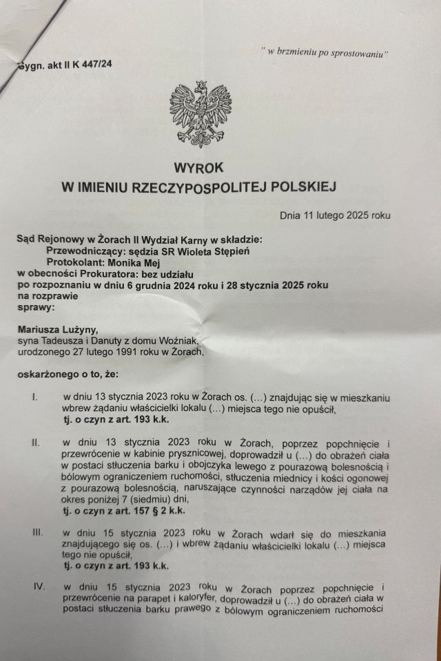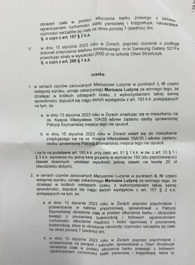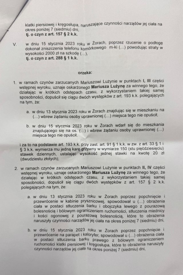 Decyzją Sądu Rejonowego w Żorach publikujemy wyrok skazujący Pana Mariusza Łużyny (Łużyna), oskarżonego o zakłócanie miru domowego i naruszenie czynności ciała trwający nie dłużej niż 7 dni. Został uznany za winnego zarzucanych mu czynów i skazano na karę grzywny, orzeczono zakaz kontaktowania się z pokrzywdzonymi, a także środek kompensacyjny w postaci obowiązku naprawienia szkody.