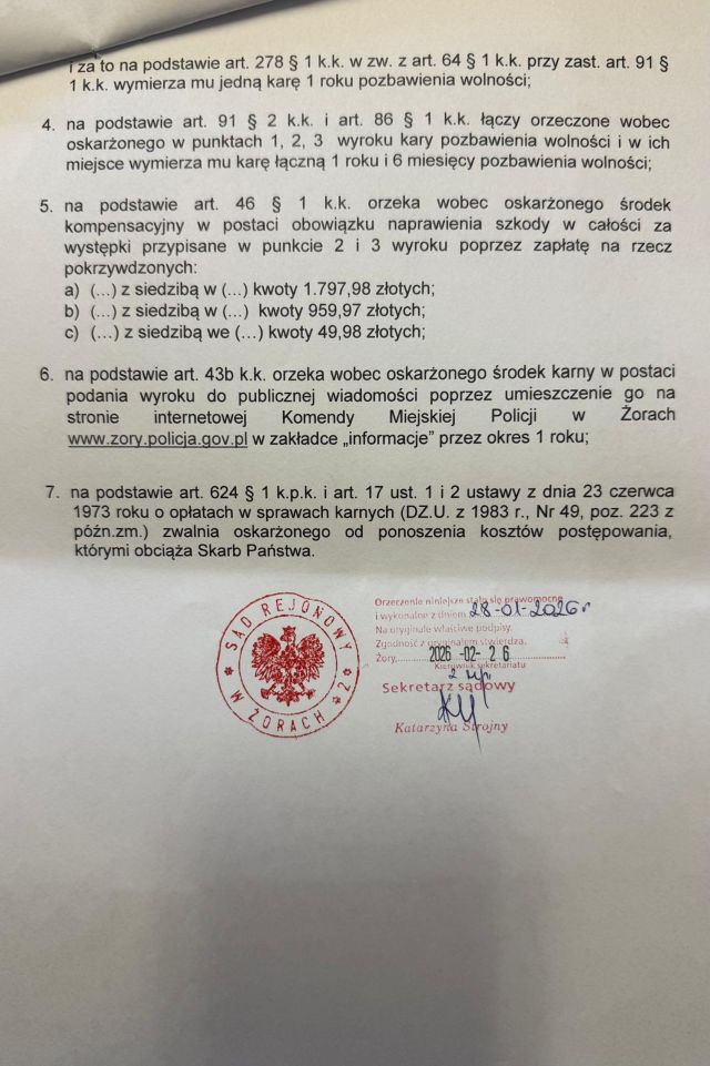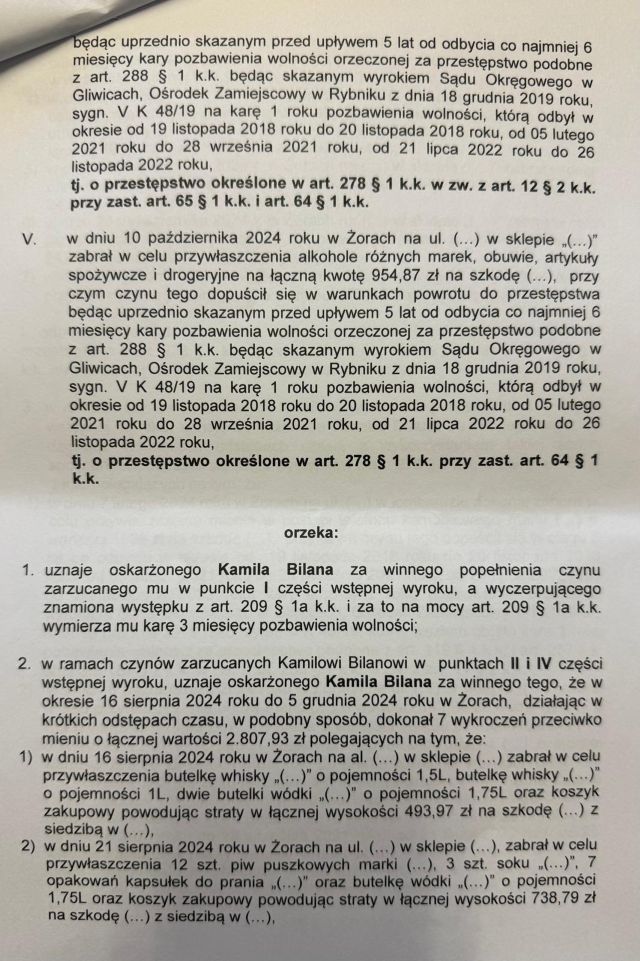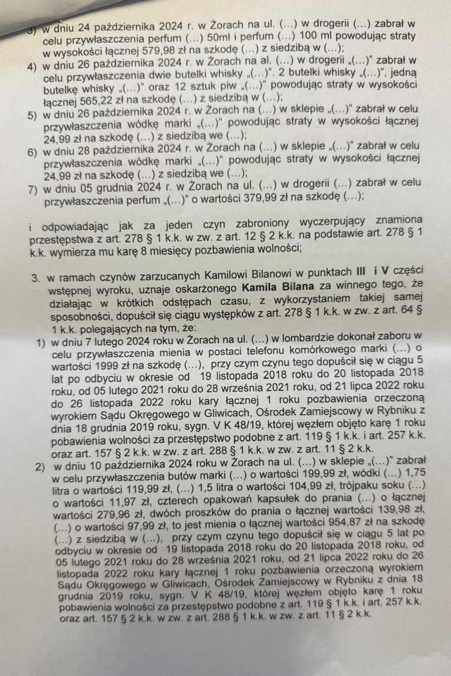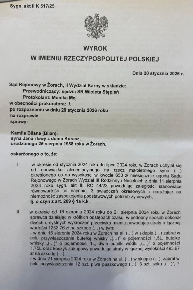 Decyzją Sądu Rejonowego w Żorach publikujemy wyrok skazujący Pana Kamila Bilana (Bilan), oskarżonego o uchylanie się od obowiązku alimentacyjnego i liczne kradzieże. Został uznany za winnego zarzucanych mu czynów i wymierzono łączną karę 1 roku i 6 miesięcy pozbawienia wolności.