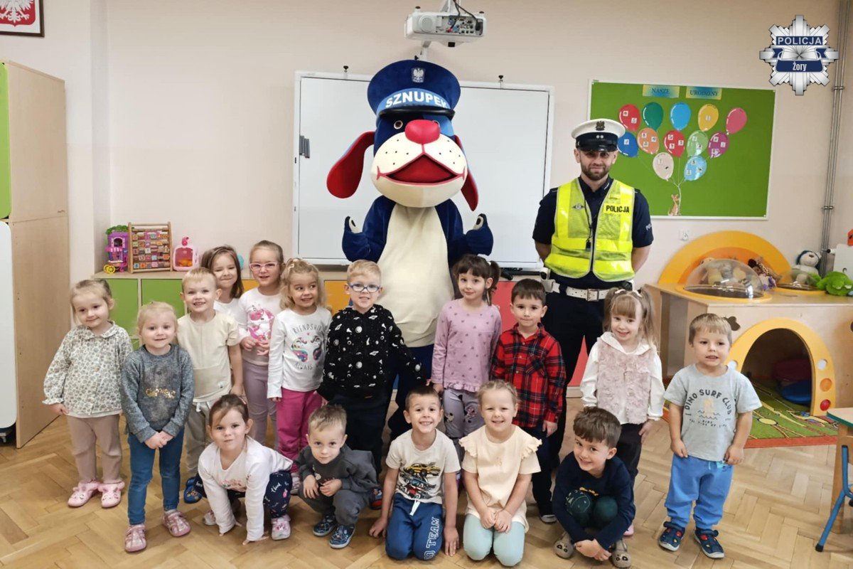 W ramach działań profilaktycznych policjant Ruchu Drogowewgo - aspirant Piotr Klimczak odwiedził także jedno z przedszkoli, gdzie rozmawiał z najmłodszymi o zasadach bezpiecznego poruszania się po drogach. Spotkanie uatrakcyjniła obecność policyjnej maskotki „Sznupka”, który wspólnie z dziećmi przypominał o tym, jak ważne jest bycie widocznym na drodze.