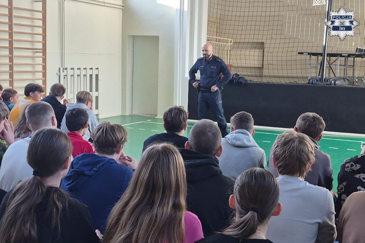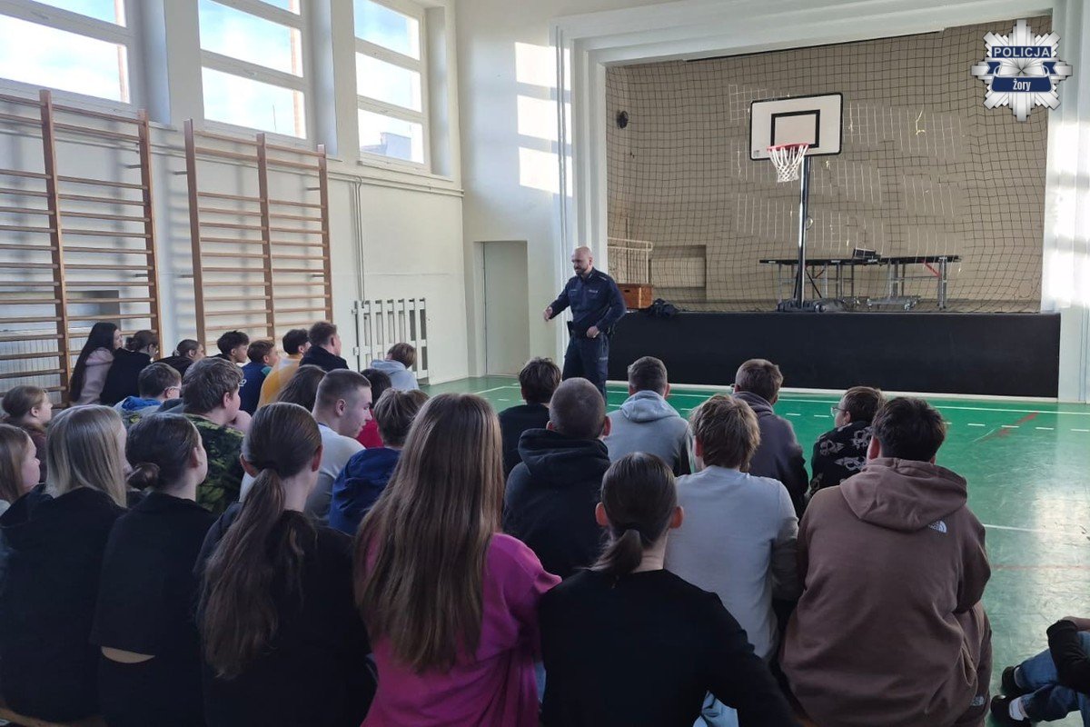 Żorscy policjanci systematycznie prowadzą działania profilaktyczne w szkołach, przypominając młodzieży, jak ważne są świadome decyzje i odpowiedzialne zachowania. W czwartek jeden z mundurowych spotkał się z uczniami klasy ósmej Szkoły Podstawowej nr 3 im. Żorskich Twórców Kultury w Żorach, by porozmawiać o zagrożeniach związanych z narkotykami, dopalaczami, alkoholem, nikotyną oraz uzależnieniami behawioralnymi – takimi jak nadużywanie Internetu czy gier komputerowych.