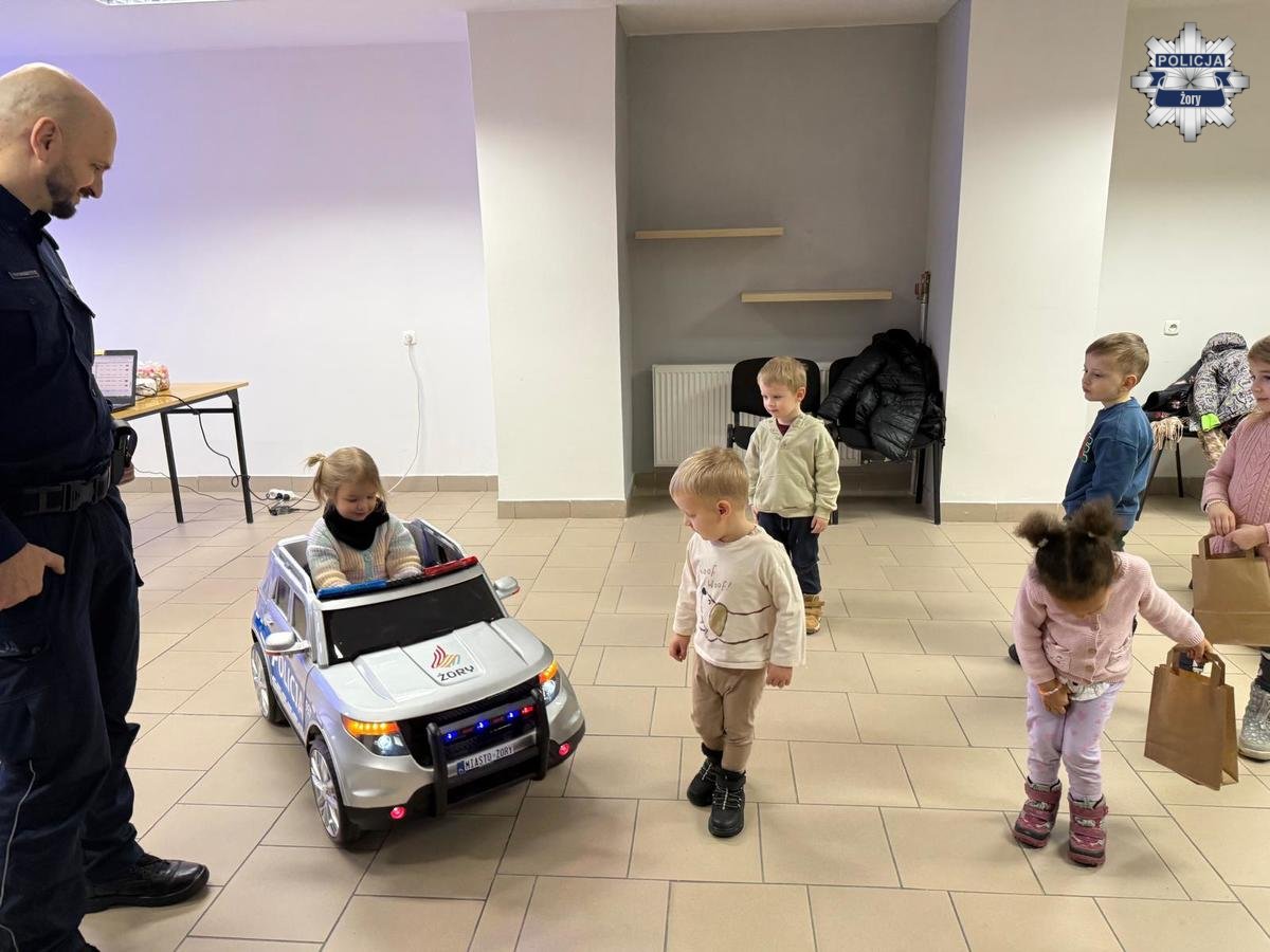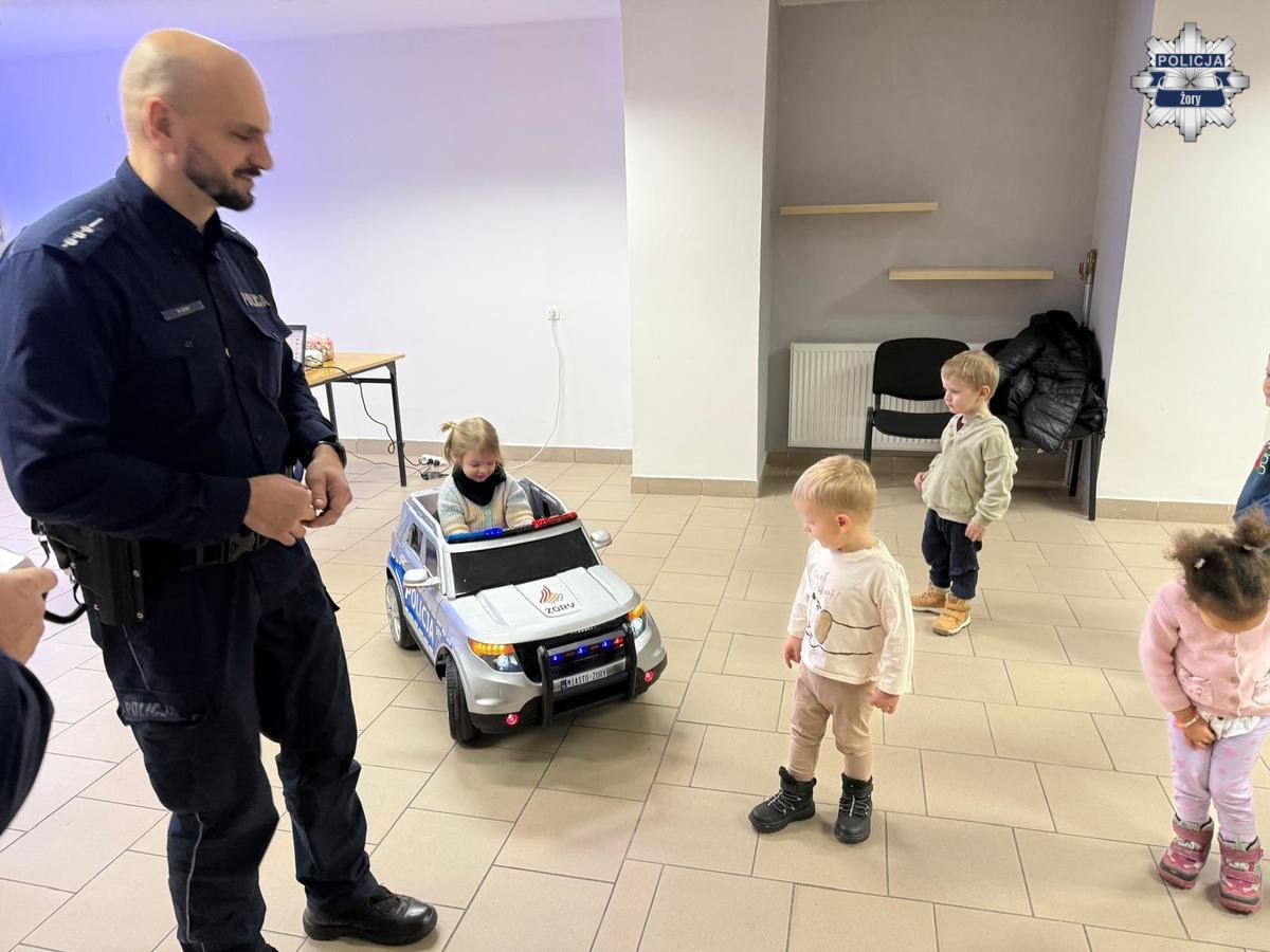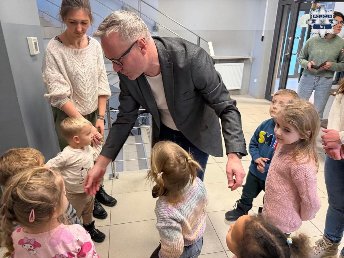 Z przedszkolakami rozmawiał Komendant Miejski Policji w Żorach podinspektor Marek Ryszka oraz jego I Zastępca - młodszy inspektor Marek Dryka, którzy opowiedzieli o służbie w Policji oraz o tym, jak ważne jest dbanie o bezpieczeństwo własne i innych. Goście mogli liczyć na symboliczny podarunek przygotowany przez żorską Policję i Zarząd Terenowy NSZZP w Żorach.