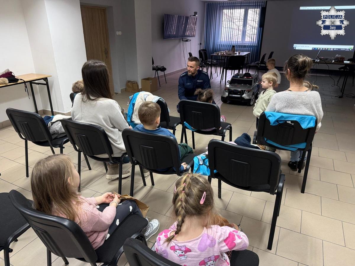 Podczas spotkania policjanci przypominali dzieciom podstawowe zasady bezpieczeństwa, zwracając szczególną uwagę na bezpieczne zachowanie w ruchu drogowym, właściwe przechodzenie przez jezdnię oraz znaczenie elementów odblaskowych. Mundurowi mówili również o zasadach bezpieczeństwa podczas nadchodzących ferii zimowych, w tym o bezpiecznych zabawach na śniegu i lodzie.