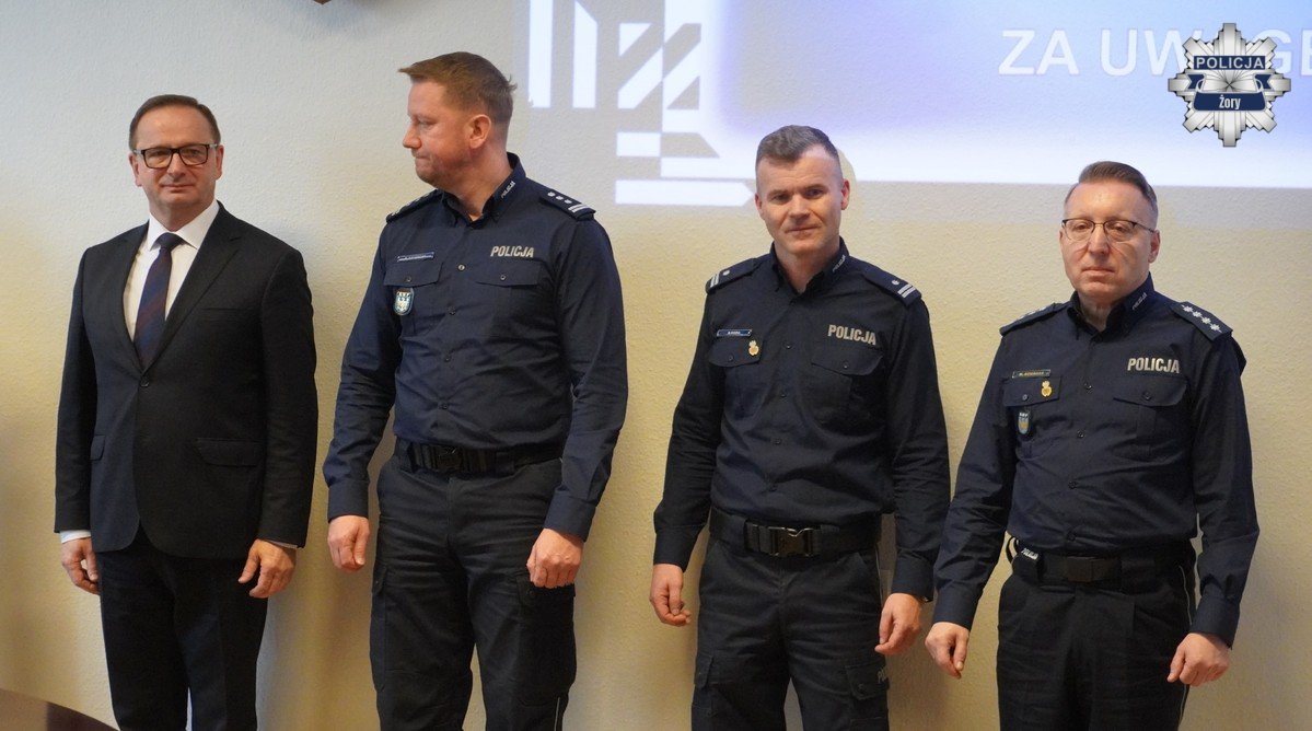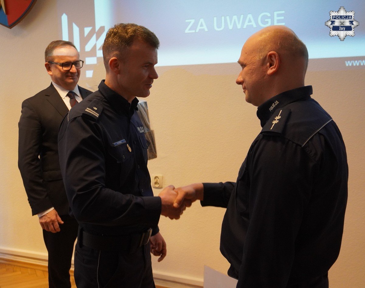 Odprawa była także okazją do uroczystego mianowania dwóch policjantów na wyższe stopnie służbowe. Szczególnym punktem spotkania było wręczenie wyróżnień — po raz pierwszy Komendant Miejski Policji w Żorach nagrodził czterech policjantów za pracę i zaangażowanie w 2025 roku w kategoriach: