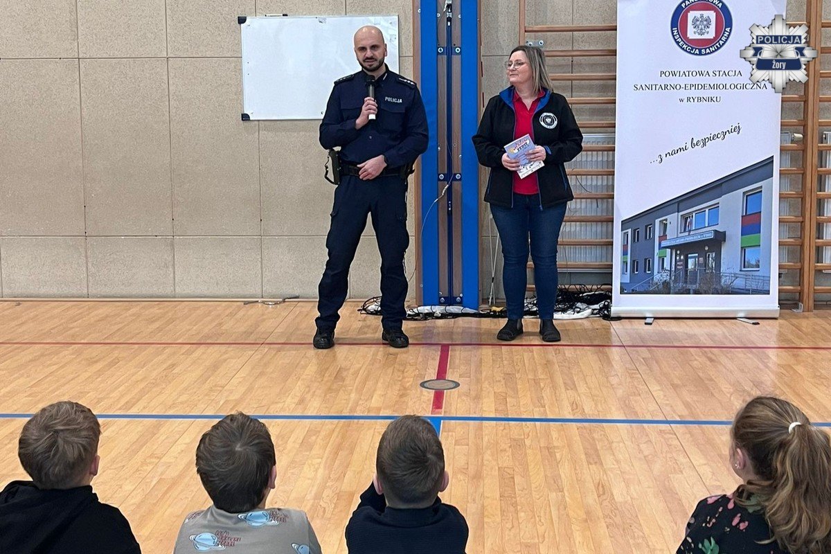 Wczoraj policjant spotkał się z uczniami Szkoły Podstawowej nr 6 w Żorach w ramach policyjnej akcji „Bezpieczne ferie”. Zajęcia odbyły się we współpracy z przedstawicielką rybnickiego Sanepidu i były elementem działań profilaktycznych prowadzonych na rzecz bezpieczeństwa dzieci i młodzieży podczas zimowego wypoczynku.