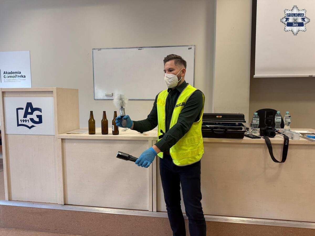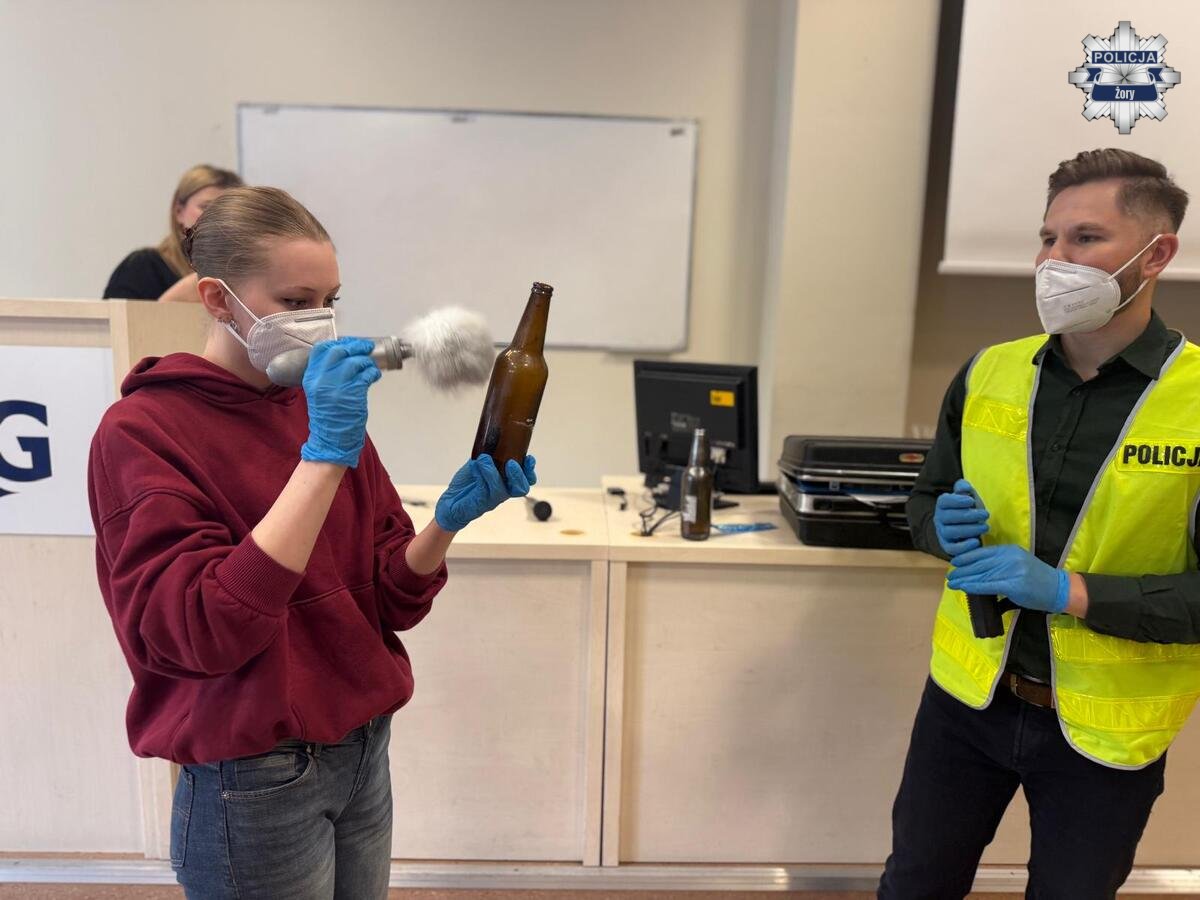 Technik kryminalistyki asp. szt. Grzegorz Marecik nie tylko opowiadał o swojej pracy, ale również w praktyczny sposób zaprezentował, jak wygląda zabezpieczanie miejsca zdarzenia, ujawnianie i zabezpieczanie śladów oraz jakie czynności wykonuje na co dzień. Uczestnicy mogli zobaczyć „od kuchni”, jak wygląda praca, która często decyduje o wykryciu sprawcy.