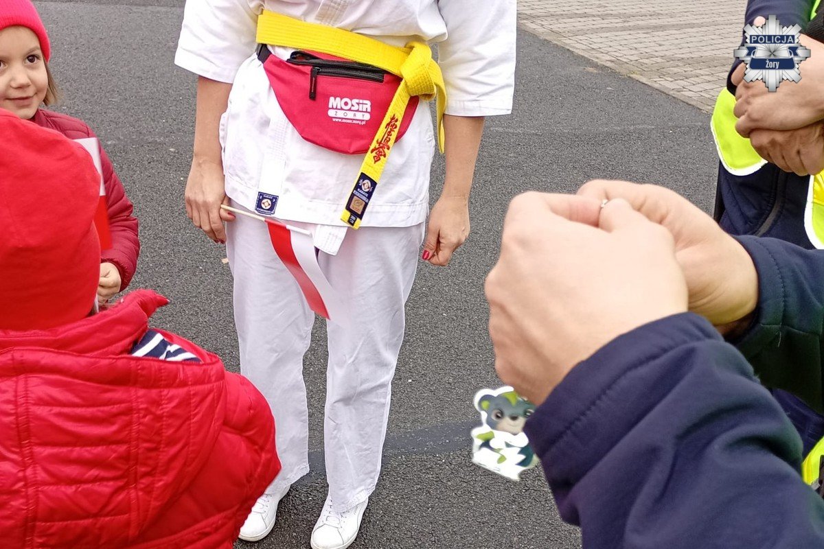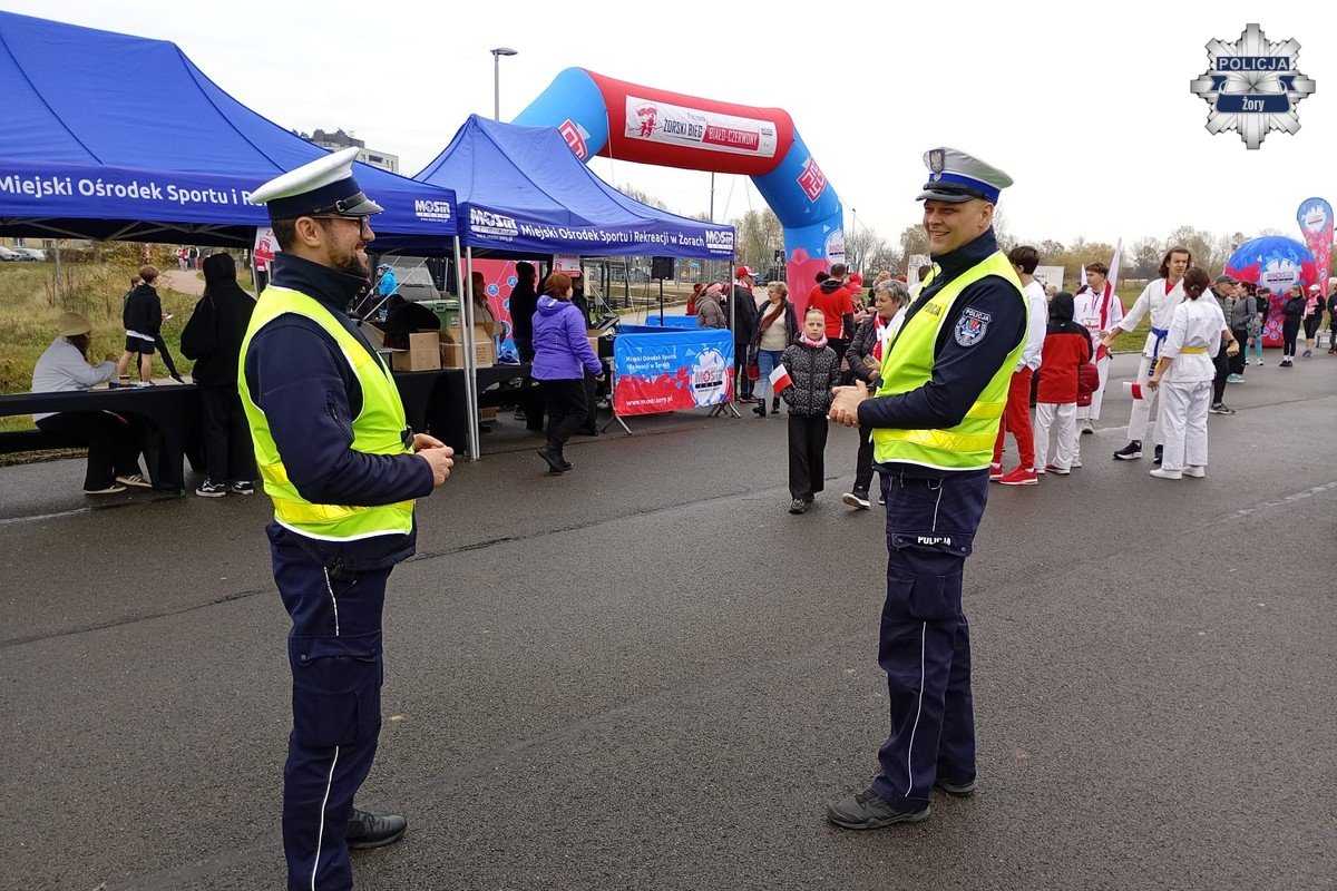 W trakcie 7. Żorskiego Biegu Biało-Czerwonego funkcjonariusze żorskiej drogówki prowadzili działania profilaktyczne w ramach ogólnopolskiej akcji „Świeć przykładem”, promując bezpieczeństwo pieszych i rowerzystów. Uczestnicy wydarzenia mogli otrzymać odblaski oraz porozmawiać z policjantami o zasadach bezpiecznego poruszania się po drogach.
